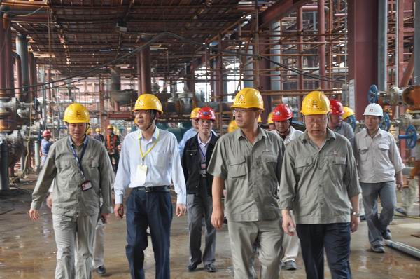 近日,中國石油化工股份有限公司副總裁張克華(左二)一行在中石化長嶺分公司董事長、黨委書記侯勇(右一)和我公司副總經理陳榮倉的陪同下,視察了我公司承建的中石化長嶺分公司油品升級改擴建工程240萬噸/年汽柴油加氫裝置現場。