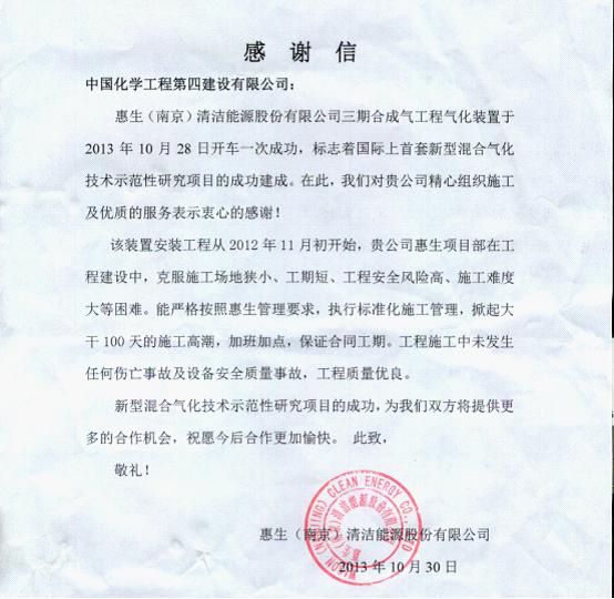 氣化裝置是繼其他各套系統(tǒng)開車成功后最后開車的核心裝置。它的成功開車標(biāo)志著全部施工任務(wù)圓滿完成。分公司在該項(xiàng)目上創(chuàng)造了工程進(jìn)度、質(zhì)量安全、業(yè)主服務(wù)三個(gè)一流,用心血和汗水為業(yè)主奉獻(xiàn)了精品工程,展示了化建湘軍的風(fēng)采,更獲得了業(yè)主來(lái)信高度贊揚(yáng)!