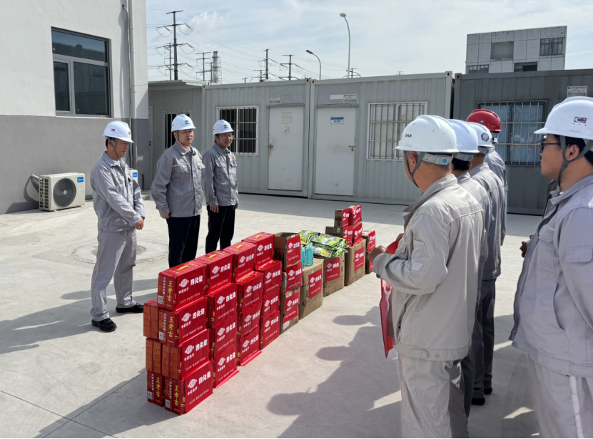 在榮盛金塘新材料項目,張勇、胥正旺向奮戰(zhàn)在高溫一線的員工送去鹽汽水、王老吉、防暑藥品等慰問品,致以殷切問候并感謝他們在烈日下的堅守。在項目現(xiàn)場,張勇仔細(xì)查看工程進展與安全生產(chǎn)情況,肯定項目取得的工作成效,強調(diào)要科學(xué)調(diào)整作業(yè)時間、落實防暑預(yù)案,確保實現(xiàn)“零中暑、零事故”;叮囑員工增強防護意識、勞逸結(jié)合,以飽滿的精神狀態(tài)打贏高溫攻堅戰(zhàn)。