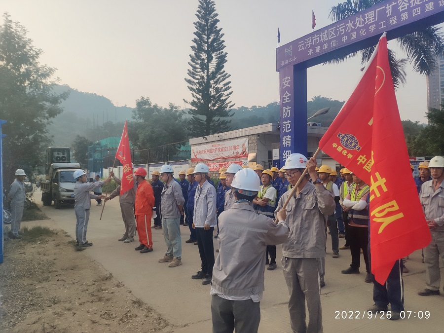 9 月 26日,華南公司粵海(云浮)城區(qū)污水項目部召開“百日會戰(zhàn)”動員部署會,并現(xiàn)場授旗,迅速掀起大干搶工熱潮。