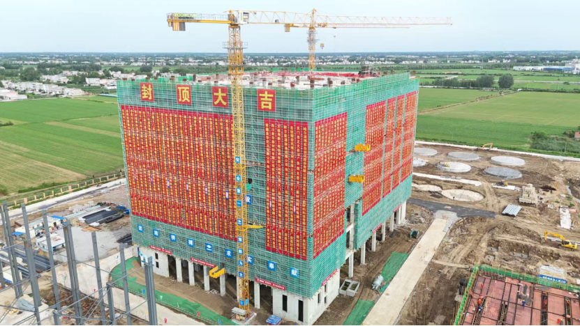 該聚合廠房主體7層局部9層,建筑高度65.7米,框架剪力墻結(jié)構(gòu),占地面積4085.64㎡,建筑面積30693.09㎡。自2024年12月12日基礎(chǔ)動土開挖以來,項目部采用標準化作業(yè)與先進工藝技術(shù),克服高支模危大工程等施工難點,以“11.5天/層”的施工速度推進建設(shè),最終提前4天完成封頂任務(wù),刷新同類化工廠房建設(shè)效率紀錄,獲業(yè)主方高度認可。